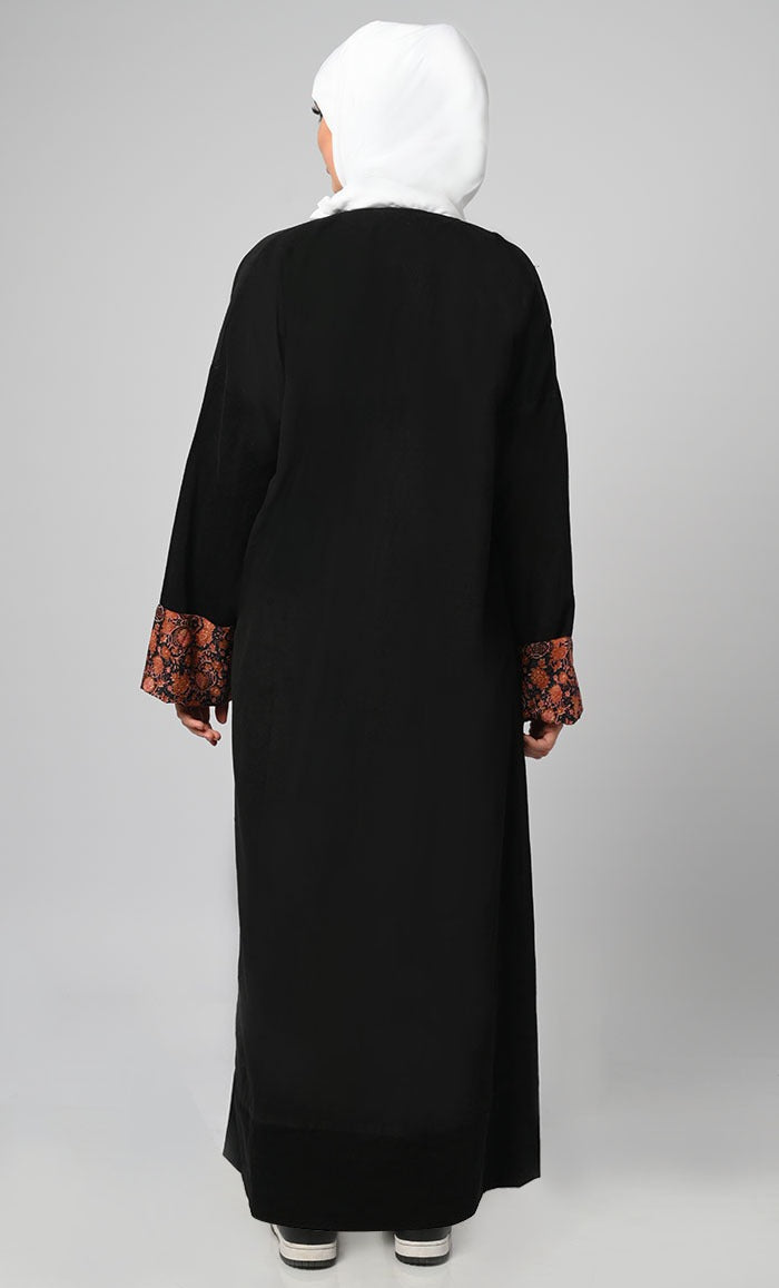 أظهري جمالك الداخلي بهذه العباءة الرائعة التي تحتوي على قماش مخملي وجيوب داخلية مطبوعة. إنها مصنوعة لمرافقتك في رحلتك المفضلة أو لتكوني المضيفة الأنيقة للغاية