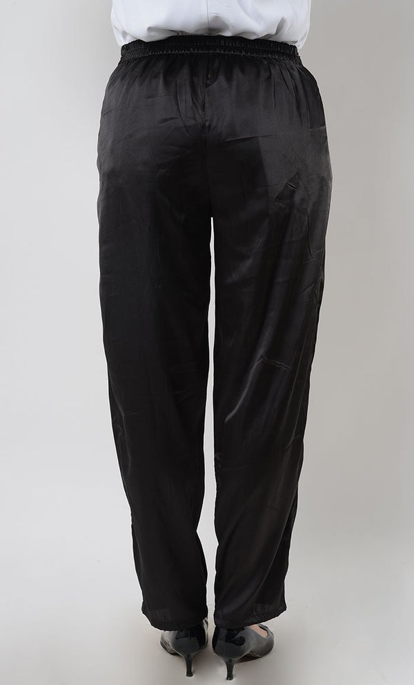 بنطلون جينز أنيق وبسيط من قماش البوليستر الساتان مع حزام خصر مطاطي وجيوب على الجانبين. إنه بنطلون أنيق وبسيط ومريح للارتداء يوميًا أو في المناسبات الرسمية أو للعمل.