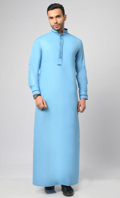 Blue Formal Modern Thobe / Jubba With Contrasting Dark Blue Embroidered Detail - Final Sale