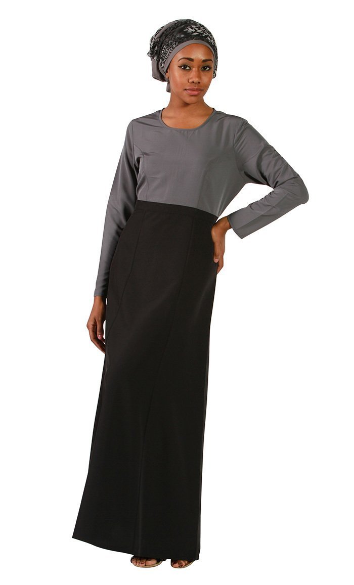 Featuring a beautiful and contemporary style modest wear arabian abaya dress in kashibo fabric adorned with contrast color grey panel on the front bodice, back and all over sleeves. It has fitted sleeves and A line modest wear and comfortable silhouette perfect to be worn for special ocassions and evening functions.