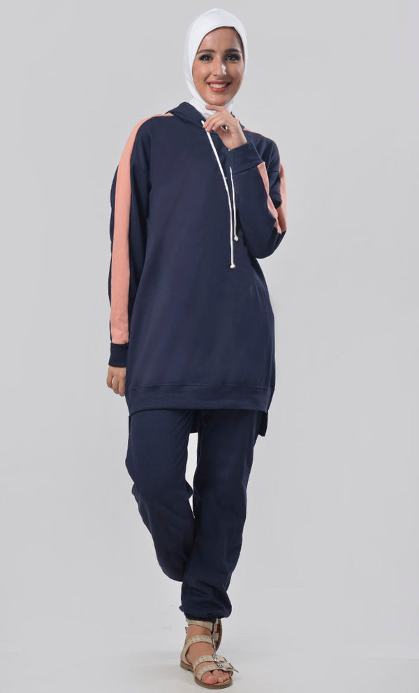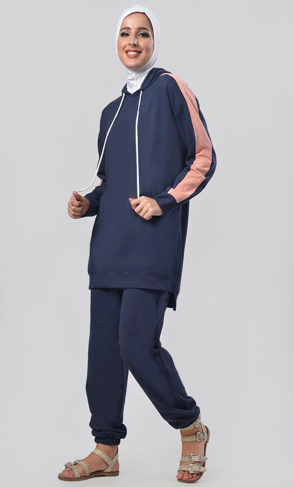 أضف لمسة من الأناقة إلى مظهرك بعد ساعات العمل مع هذه المجموعة العصرية متعددة الاستخدامات والتي تتميز بلوحة متباينة الألوان على الأكمام وشريط دوري أبيض مضاف إلى القلنسوة. ستساعدك هذه المجموعة المعاصرة على إتقان أي نشاط رياضي تقريبًا. ارتديها مع حذاء رياضي لطيف لتبدو في أفضل حالاتك.