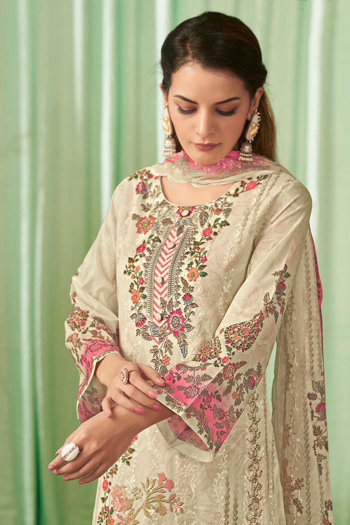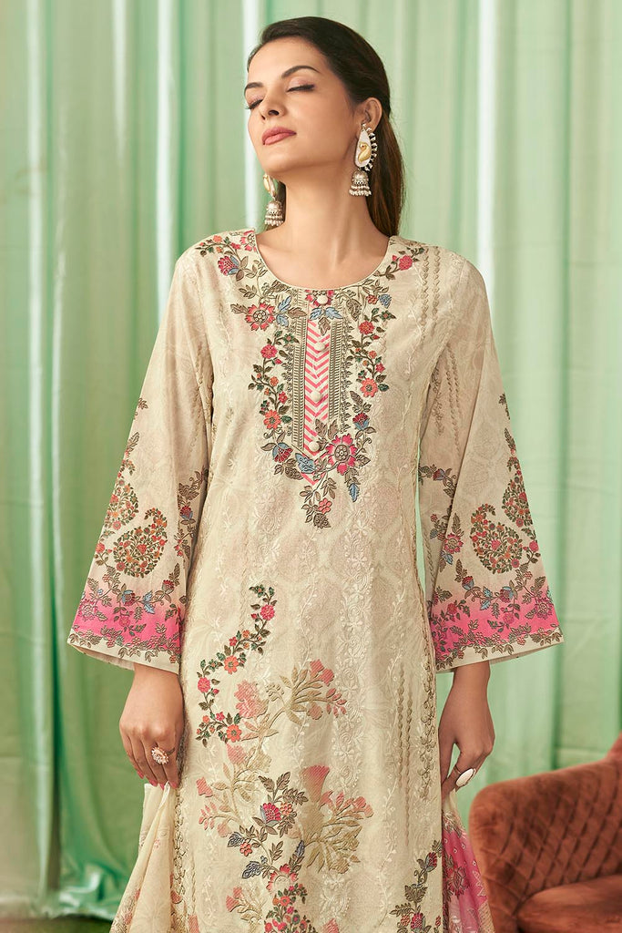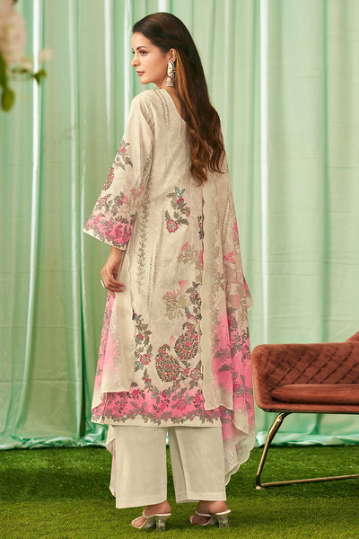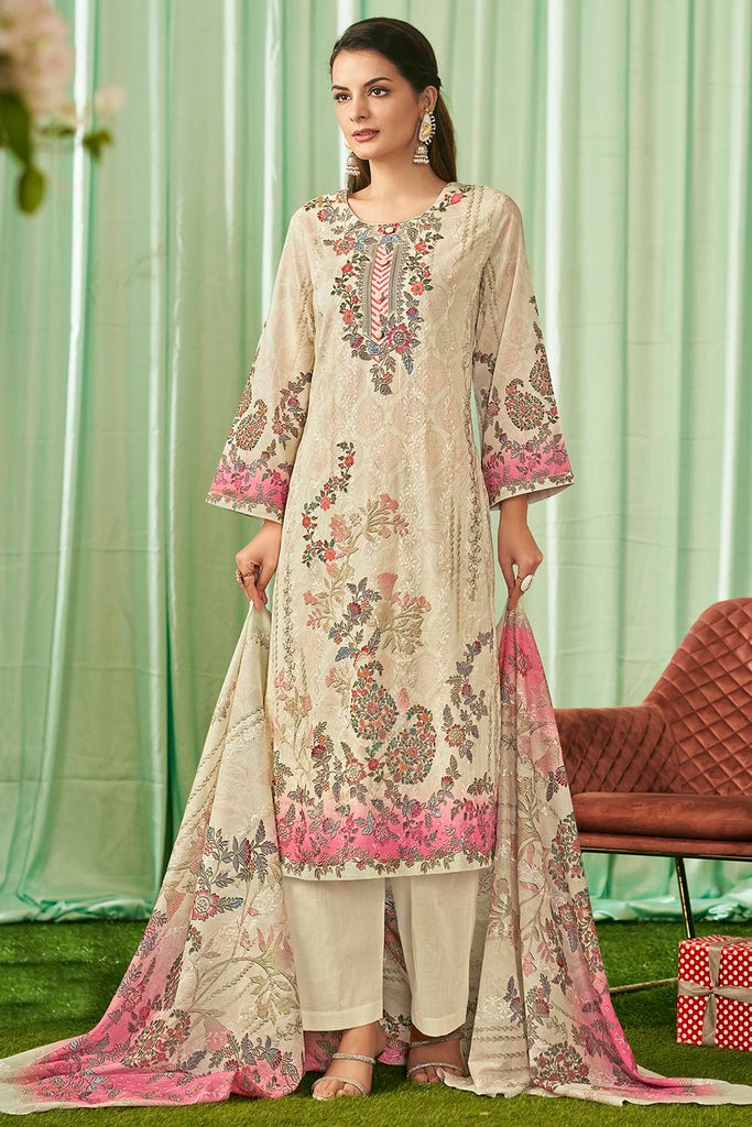 Refresh your ethnic collection with this elegant printed cotton kameez pant set. The A-line cotton kurta features a round neckline and 3/4th sleeves, adorned with vibrant floral prints that bring charm and grace to any occasion. It is paired with straight cotton pants and a matching printed cotton dupatta for a breezy, comfortable yet stylish outfit. Perfect for casual gatherings, festive wear, and office wear.