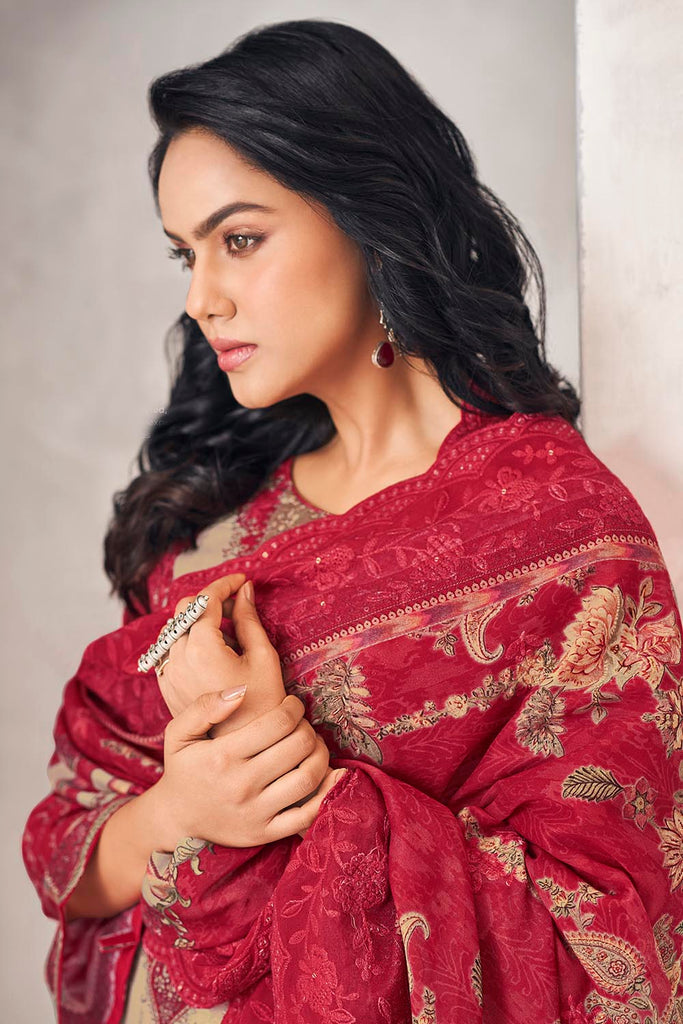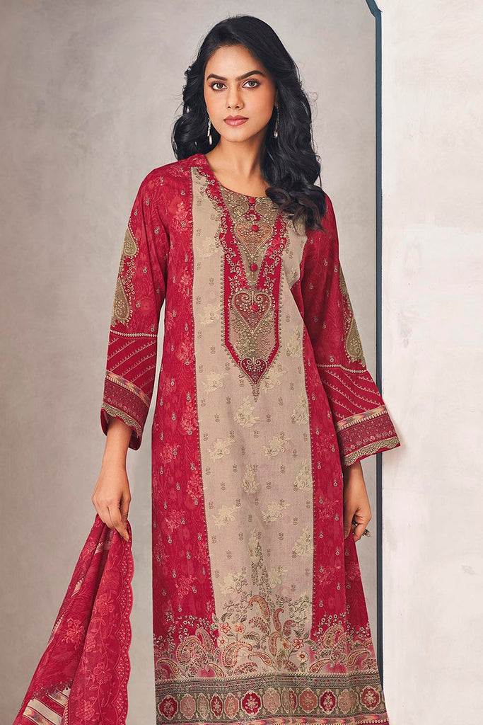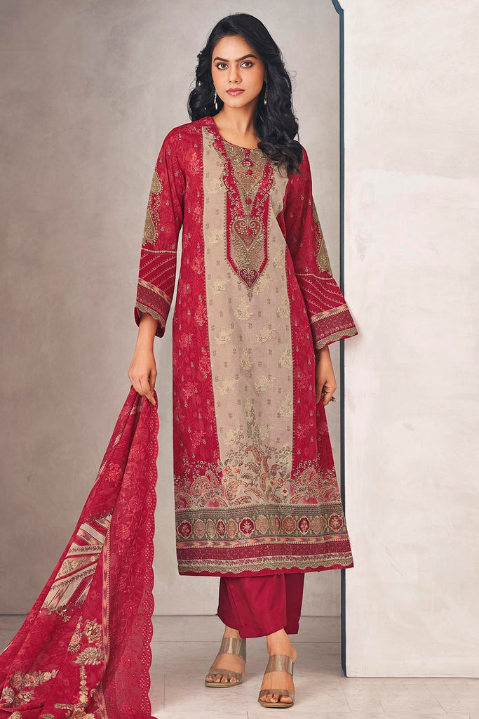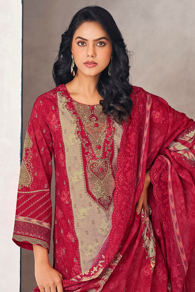 Refresh your ethnic collection with this elegant printed cotton kameez pant set. The A-line cotton kurta features a round neckline and 3/4th sleeves, adorned with vibrant floral prints that bring charm and grace to any occasion. It is paired with straight cotton pants and a matching printed cotton dupatta for a breezy, comfortable yet stylish outfit. Perfect for casual gatherings, festive wear, and office wear.