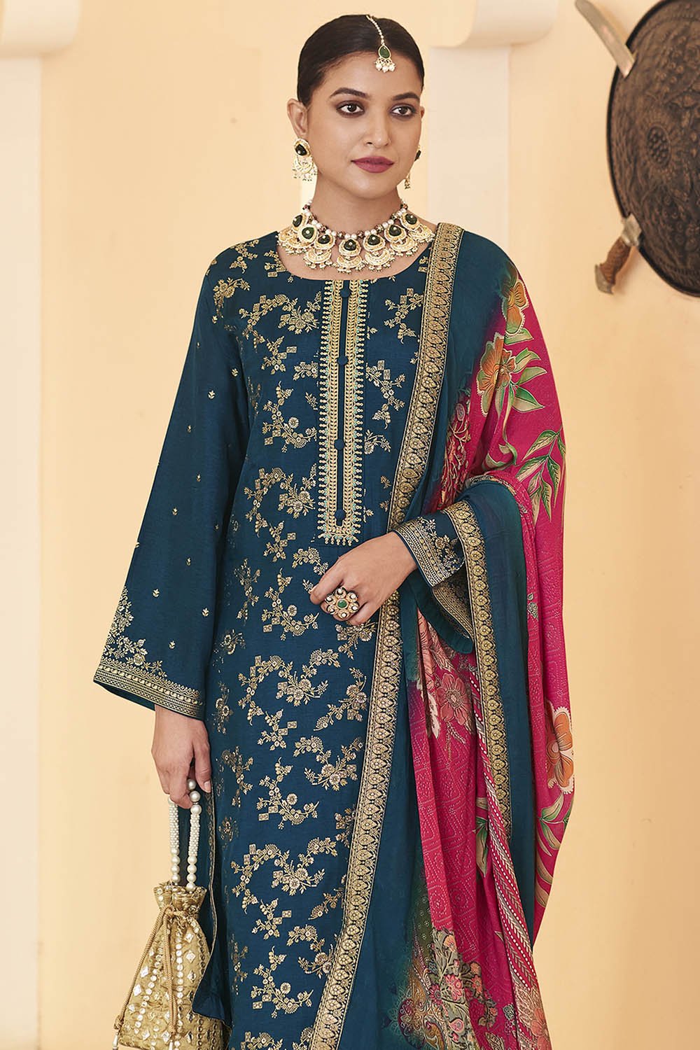 Elevate your festive and wedding look with this elegant A-line kurta pant set. Crafted with a silk embroidered kurta featuring delicate sequin detailing, round neck, and 3/4th sleeves, this outfit blends comfort and style. The kurta pairs beautifully with straight cotton pants and a vibrant silk printed dupatta, adding a regal charm to your ensemble. Perfect for weddings, festive celebrations, or special occasions.