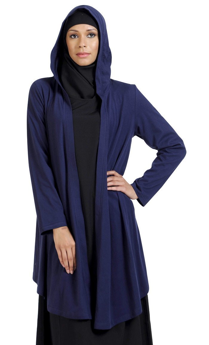 Featuring a modest wear and comfortable front open hoodie style extra long asymmetrical cardigan in cotton knit fabric with hoodie at the back and flared pleated panels on both the sides. Its ideal for the breezy winters and the built in hood adds more to a regular shrug or winter cardigan. It sports an open front without buttons for an easy fit. Wear a warmer inside to carry off this look.