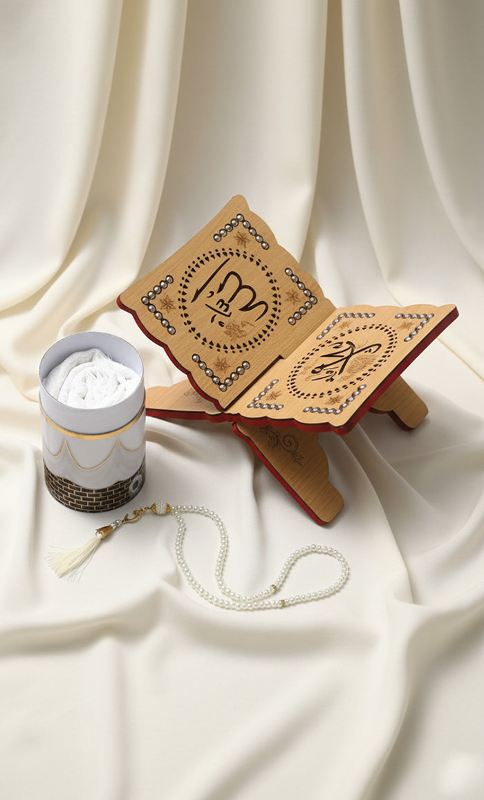 ارتقِ بلحظاتك الروحانية مع مجموعة الهدايا الإسلامية الرائعة هذه، والتي تضم سجادة صلاة فاخرة، وحامل قرآن خشبي مصنوع يدويًا، وسبحة مطابقة. صُممت هذه المجموعة بعناية لتوفير الراحة والتفاني، وهي هدية مثالية للأحباء أو إضافة خاصة إلى أساسيات صلاتك.