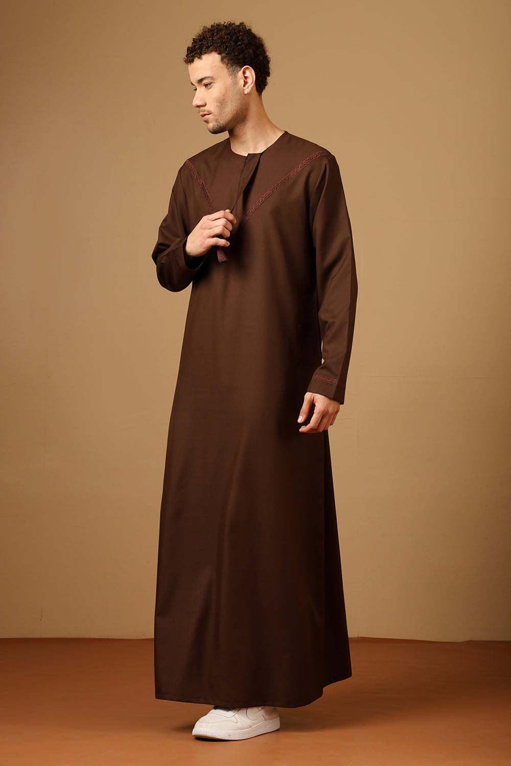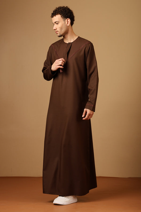 صُمم هذا الثوب اليومي للراحة والأناقة، وهو مصنوع من نسيج قطني عالي الجودة، مما يوفر التهوية والمتانة للارتداء طوال اليوم. يوفر خط العنق المستدير بفتحة بسحاب سهولة الارتداء، بينما يضيف التطريز الأبيض على الرقبة لمسة راقية وأنيقة. يتميز هذا الثوب بأكمام كاملة لتغطية متواضعة وجيوب على الجانبين من أجل التطبيق العملي، وهو مثالي للصلاة والنزهات غير الرسمية والأنشطة اليومية.