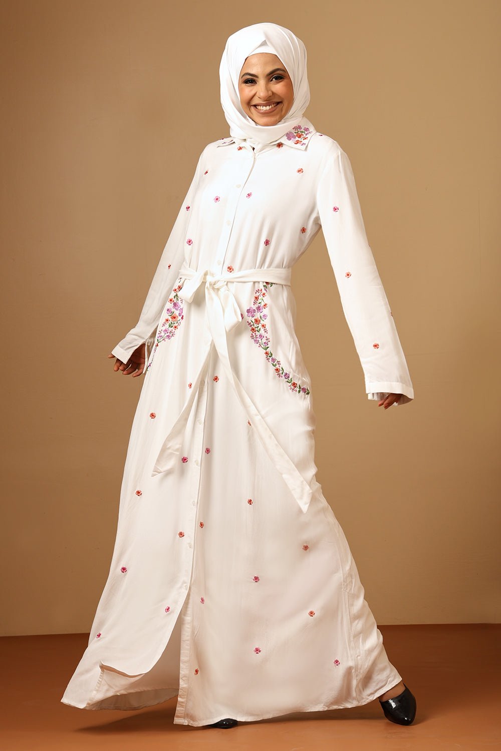The abaya features a classic shirt collar with full front button-down closure, offering both versatility and ease of wear. Delicate embroidery detailing runs beautifully all over the panels, adding artisanal charm without overpowering the minimal design.
