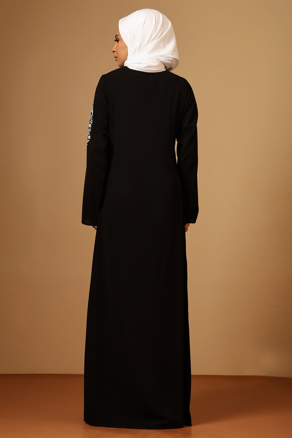 Pair with a white or neutral hijab to highlight the contrast embroidery. Add minimal silver accessories for a polished modest look.