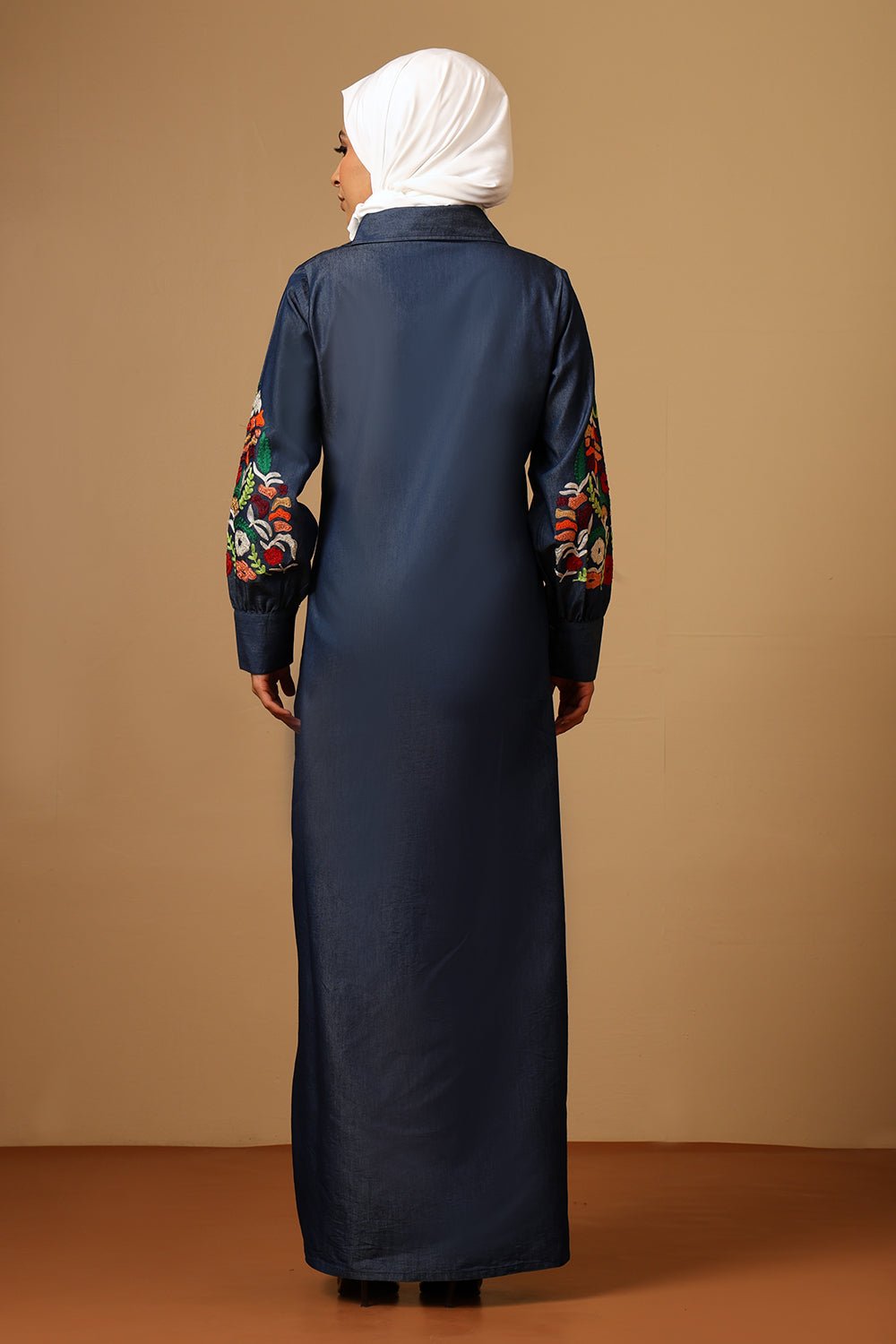 Elevate your modest wardrobe with this elegant denim abaya dress, beautifully adorned with vibrant silk thread floral embroidery on the front and sleeves.