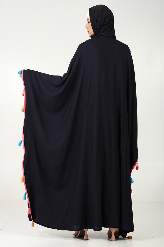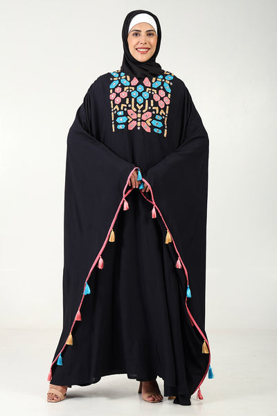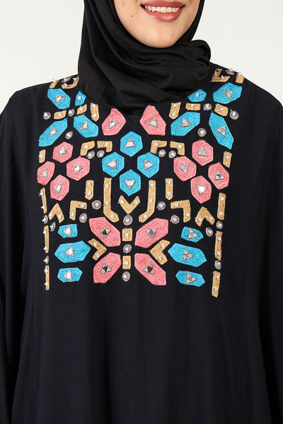 احتفلي بعيد الأضحى بأناقة مع هذا الفستان الرائع من العباية على شكل قفطان، المصنوع من قماش رايون ناعم وجيد التهوية لإطلالة مريحة وأنيقة. تضيف أكمام القفطان المنسدلة لمسة من الأناقة، بينما يضمن خط العنق المستدير ملاءمة متواضعة وجذابة. تتميز هذه العباية بتطريز هندسي متعدد الألوان نابض بالحياة، وزخارف معقدة على شكل مرآة، وتفاصيل شرابة، وتمزج بين الفن التقليدي والأزياء المعاصرة. مثالية للمناسبات الاحتفالية والتجمعات الخاصة والاحتفالات، هذه القطعة ضرورية لأولئك الذين يحبون الموضة المحتشمة مع لمسة نابضة بالحياة وأنيقة.