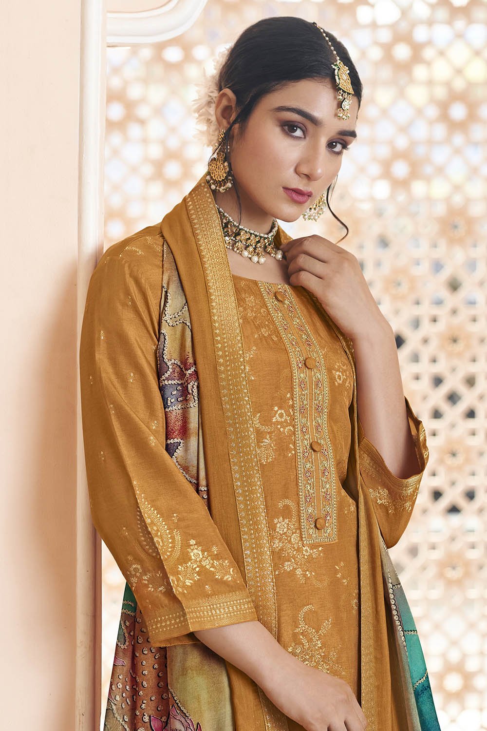 Elevate your festive and wedding look with this elegant A-line kurta pant set. Crafted with a silk embroidered kurta featuring delicate sequin detailing, round neck, and 3/4th sleeves, this outfit blends comfort and style. The kurta pairs beautifully with straight cotton pants and a vibrant silk printed dupatta, adding a regal charm to your ensemble. Perfect for weddings, festive celebrations, or special occasions.