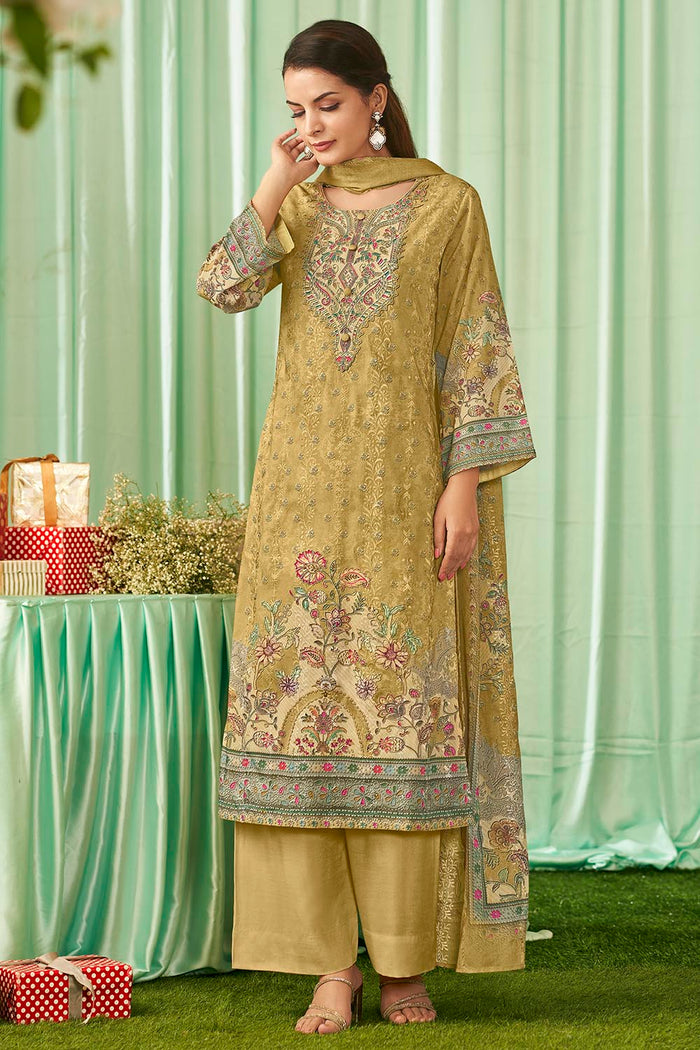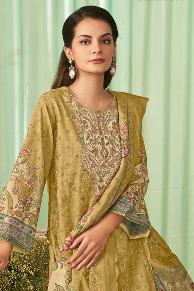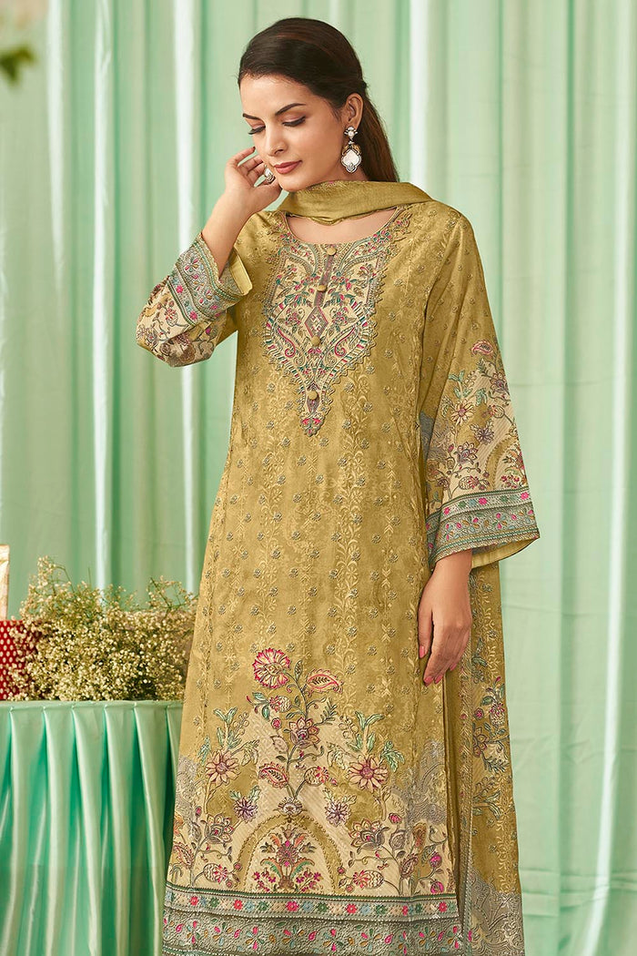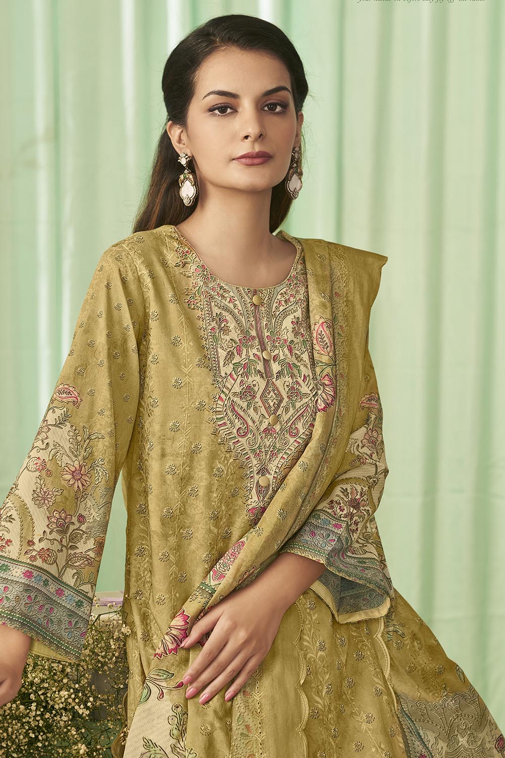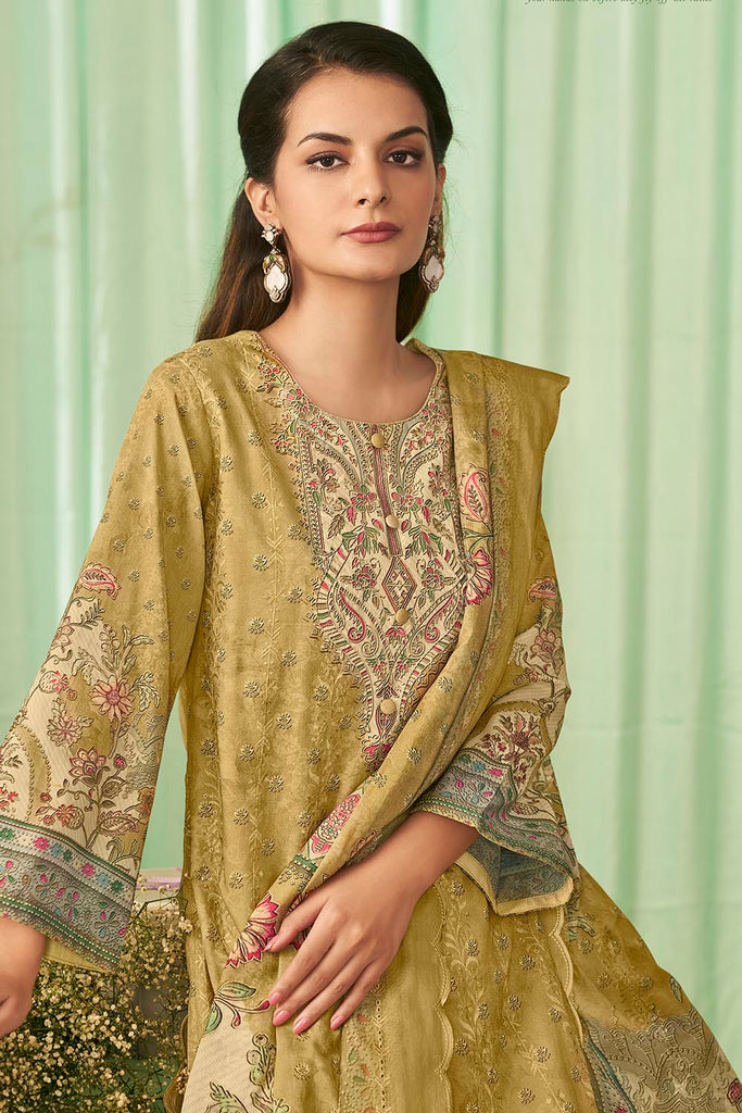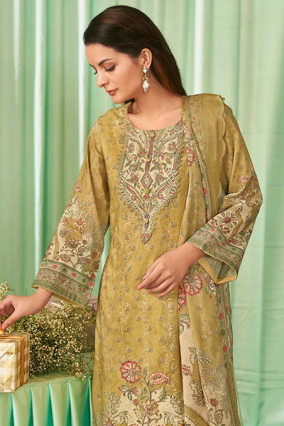 Refresh your ethnic collection with this elegant printed cotton kameez pant set. The A-line cotton kurta features a round neckline and 3/4th sleeves, adorned with vibrant floral prints that bring charm and grace to any occasion. It is paired with straight cotton pants and a matching printed cotton dupatta for a breezy, comfortable yet stylish outfit. Perfect for casual gatherings, festive wear, and office wear.