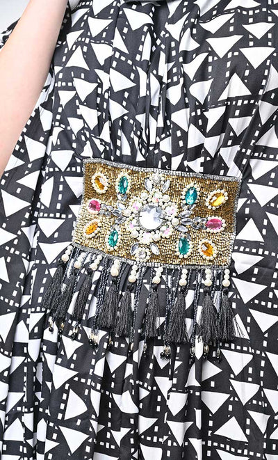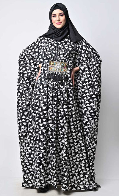 يتميز الفستان بفتحة رقبة على شكل حرف V مع تطريزات ثقيلة على الخصر وأكمام كاملة على شكل قفطان وحزام مخفي لملاءمة عصرية