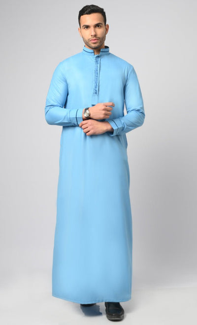 Blue Formal Modern Thobe / Jubba With Contrasting Dark Blue Embroidered Detail - Final Sale