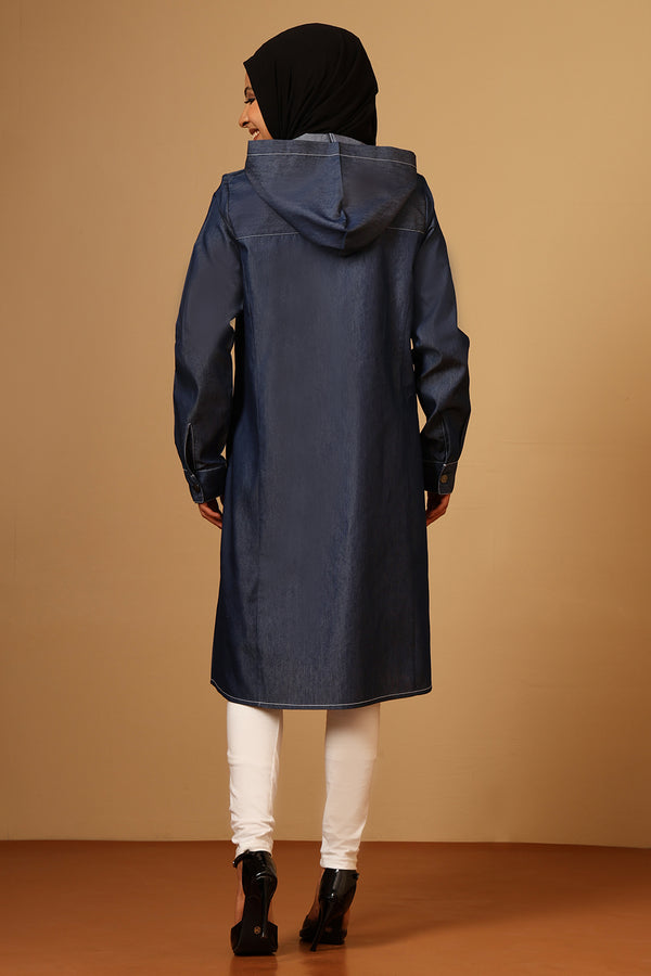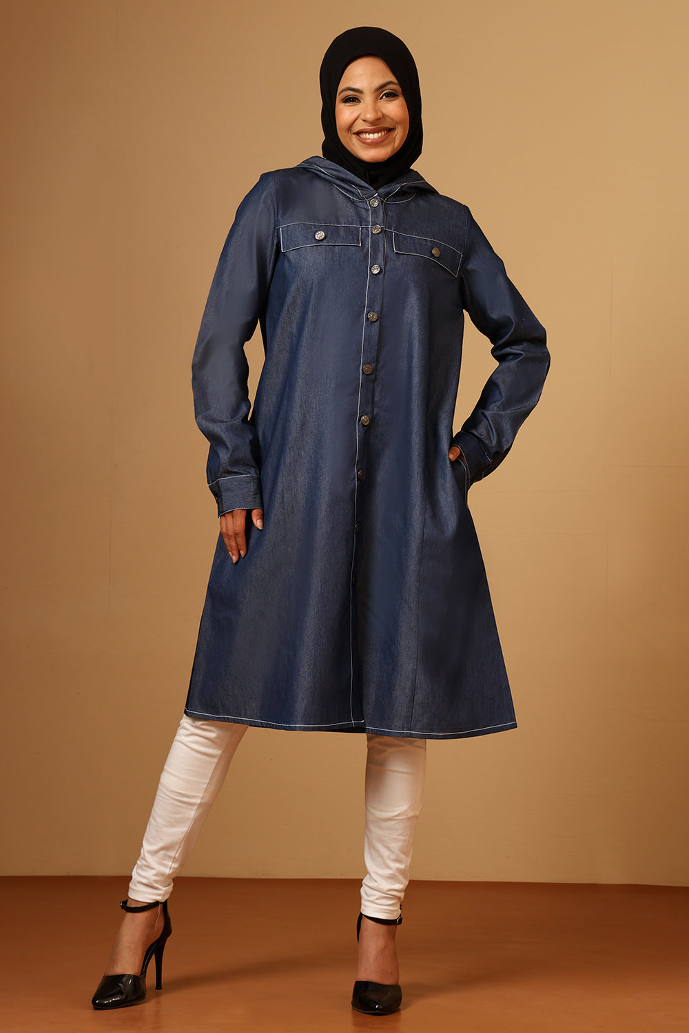 Upgrade your modest casual wardrobe with this stylish denim hooded tunic. Designed with a full button-front opening and structured cuffed sleeves, this piece blends comfort with contemporary appeal. The soft-washed denim finish gives it a modern look, while the hood detail adds a sporty touch. Perfect for everyday wear, travel, or casual outings, it pairs effortlessly with leggings, trousers, or jeans.
