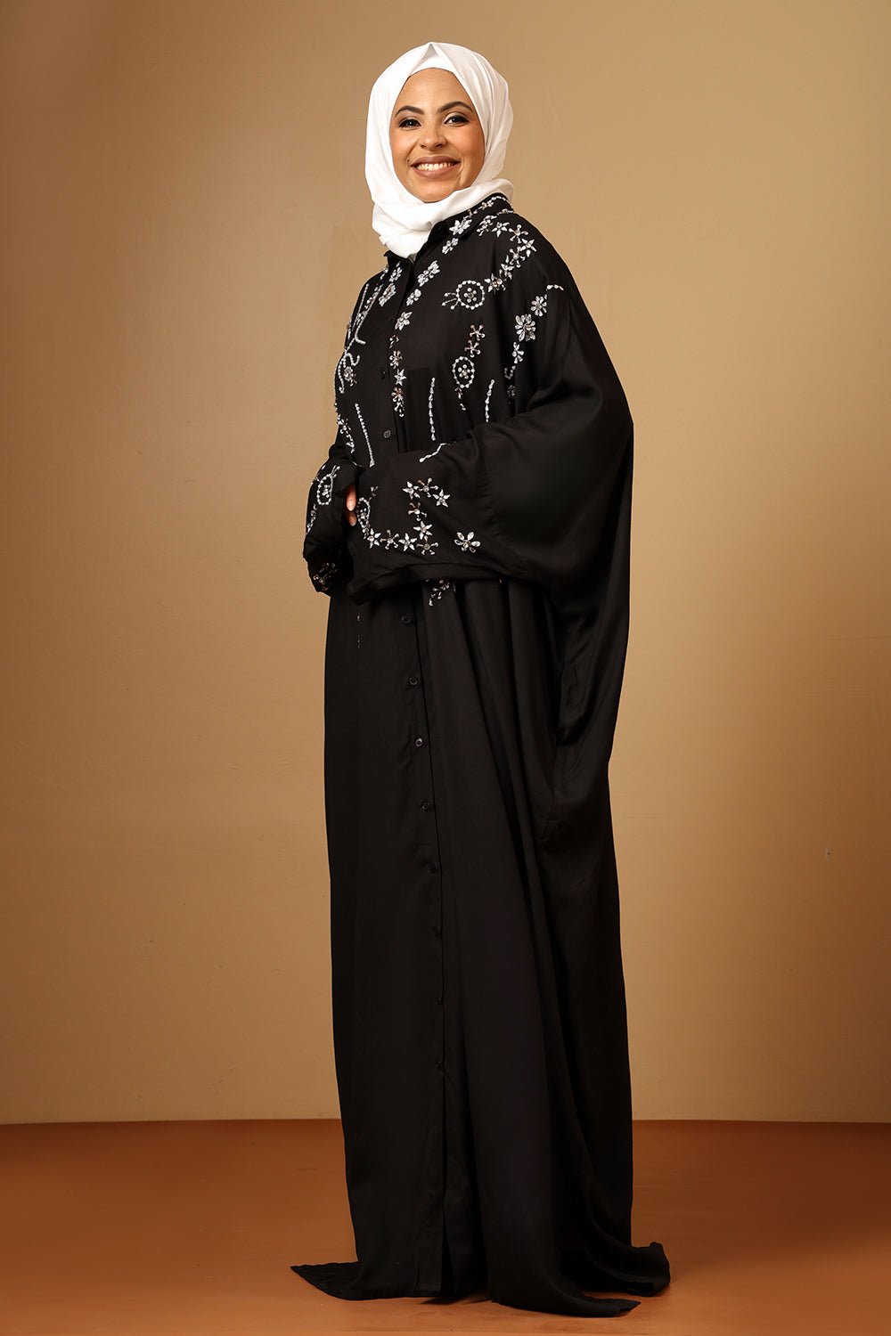 Graceful, glamorous, and effortlessly modest — this black rayon kaftan is designed to make a statement. Featuring a flattering V-neckline with a front button-down detail, this kaftan blends contemporary elegance with traditional charm.