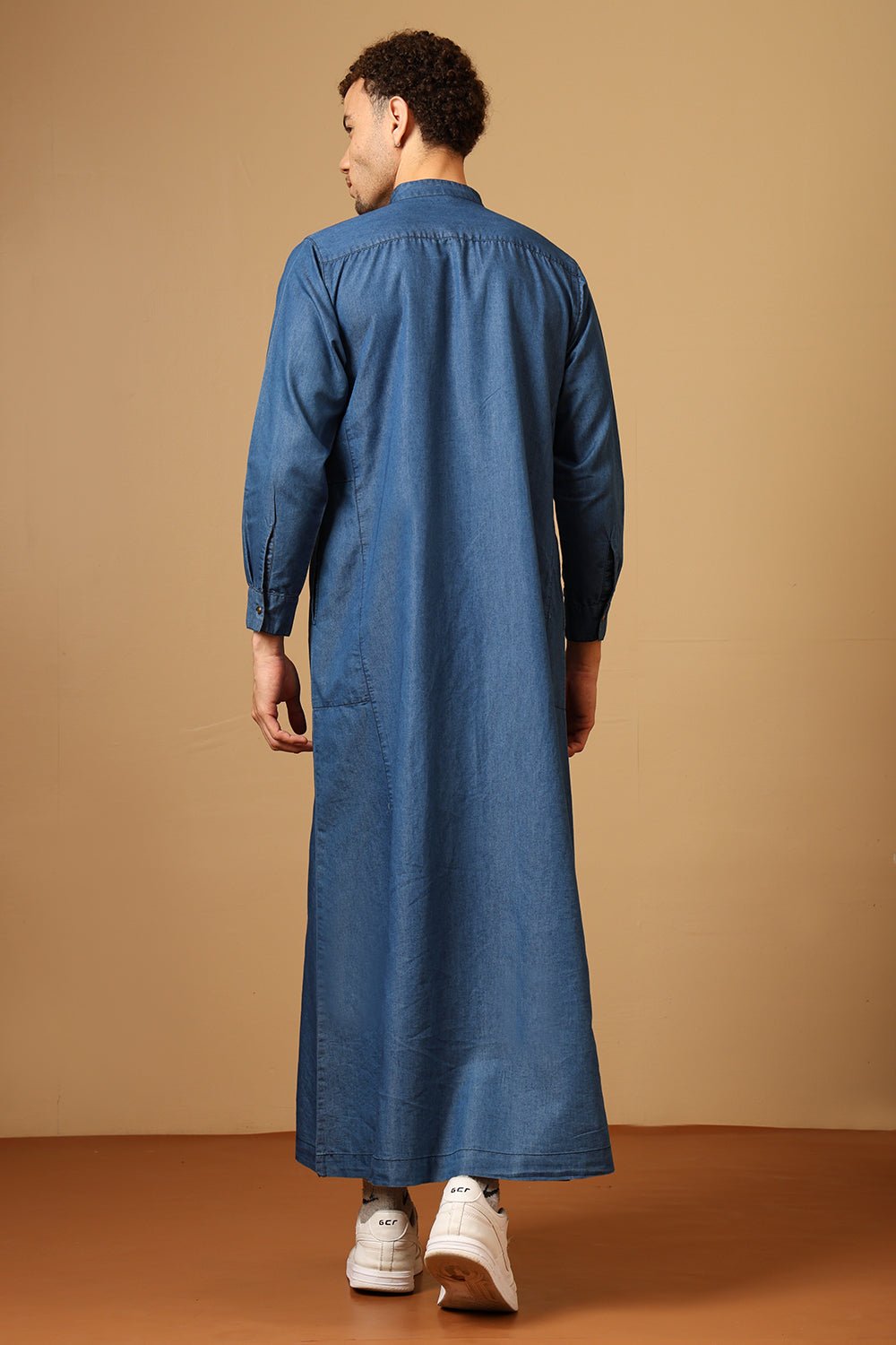 Designed for the modern man who values tradition with a contemporary touch, this denim thobe offers effortless style and comfort. Crafted from soft, breathable denim fabric, it features a sleek mandarin collar with a front button placket for a refined finish.