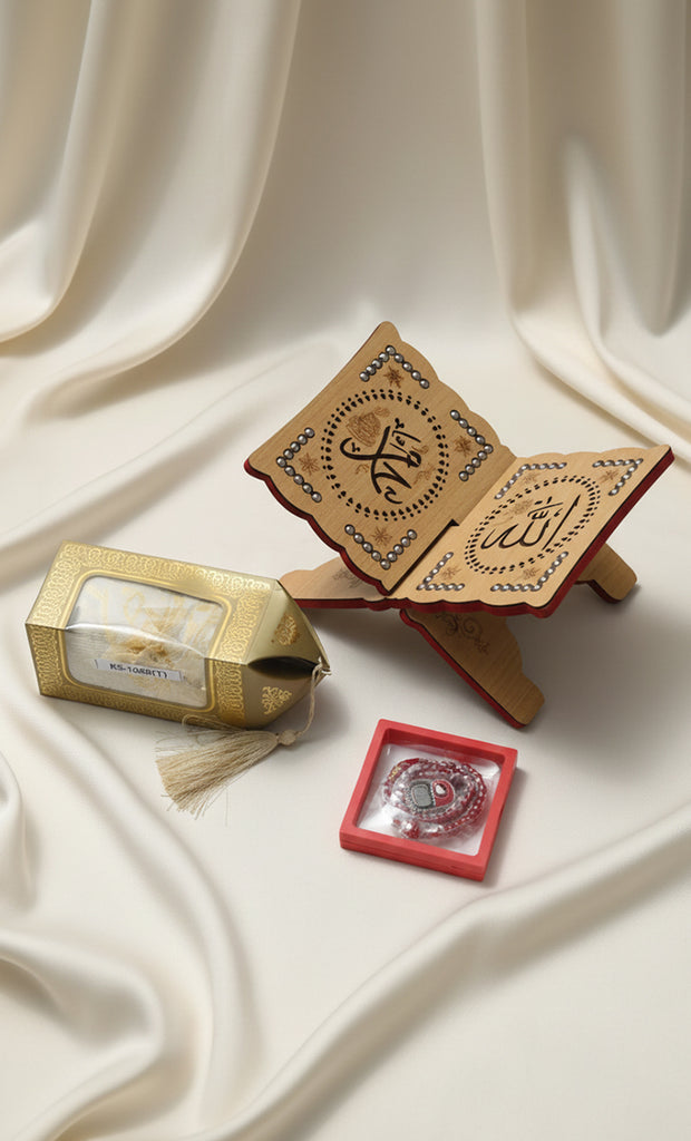 Elevate your spiritual moments with this beautifully curated Islamic gift set, featuring a premium prayer rug, a handcrafted wooden Rehal (Quran stand), and a matching Tasbeeh (prayer beads). Thoughtfully designed for comfort and devotion, this set makes an ideal gift for loved ones or a special addition to your own prayer essentials.