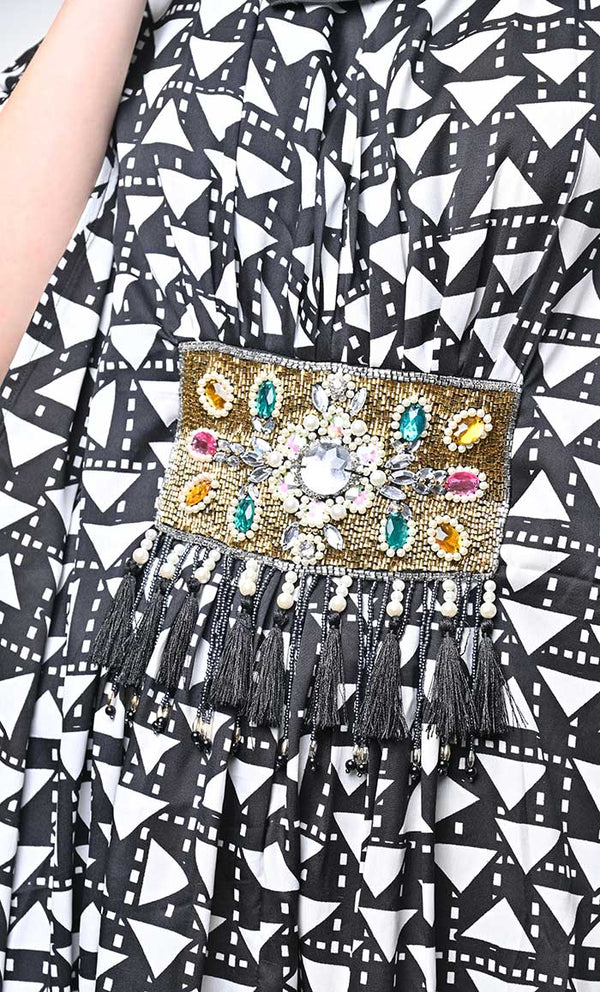 Dress has as V- neck with embellished heavy applique work on waist ,full flairy kaftan style sleeves and included hidden belt for your modern fit