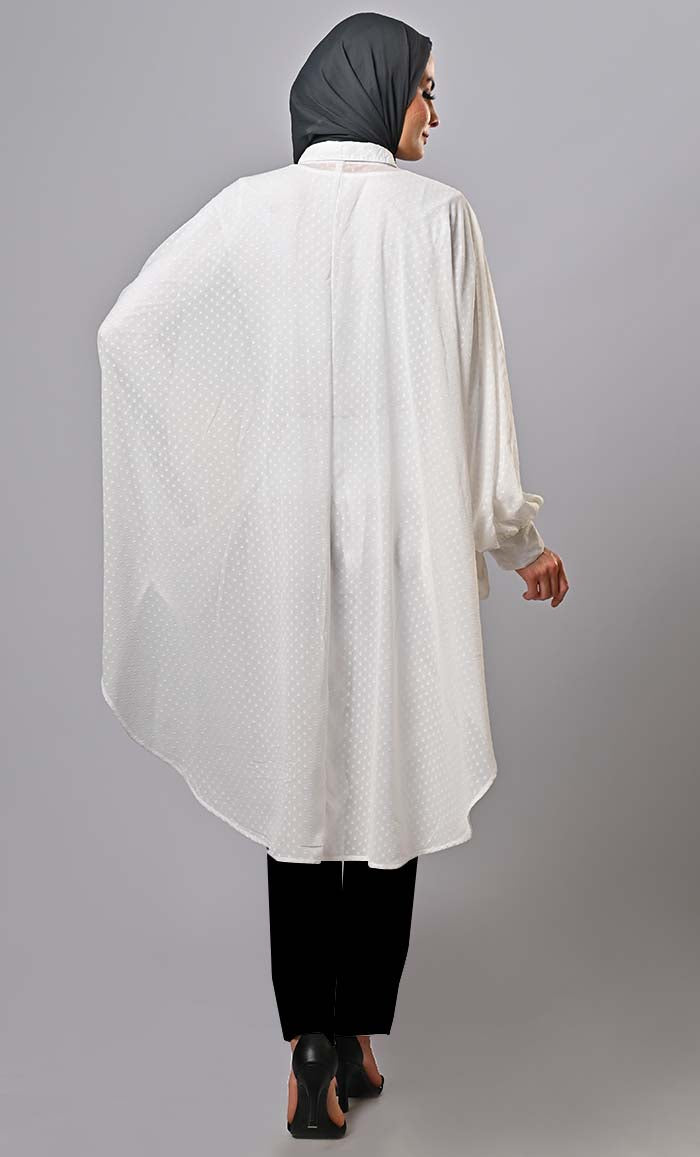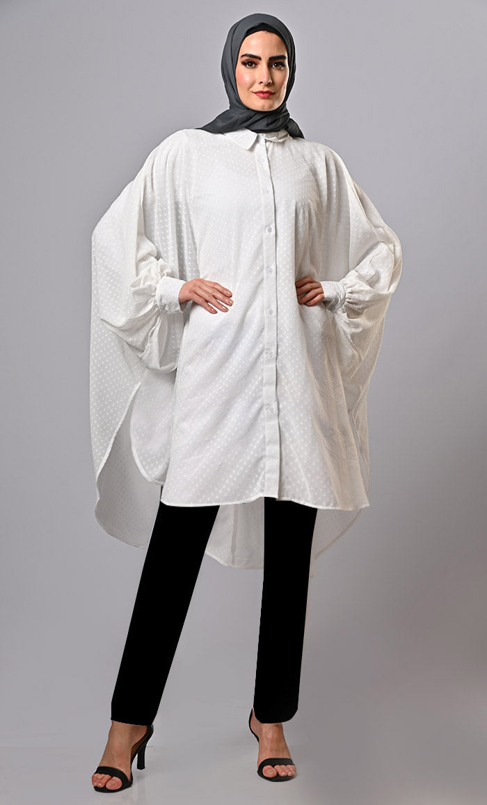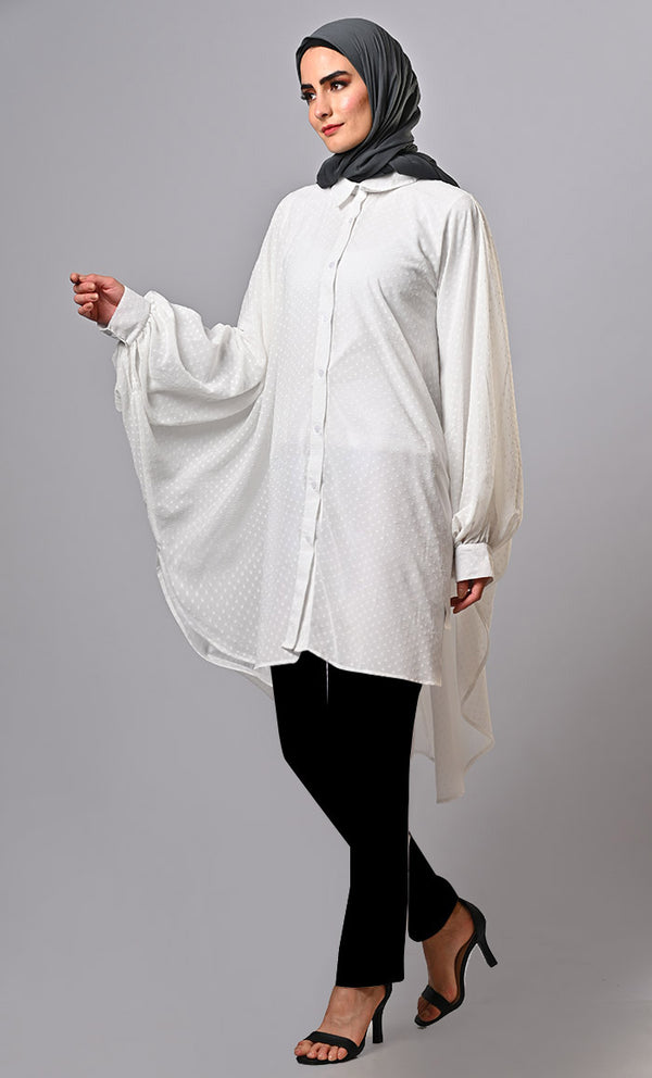 It combines modern design with comfort. Its unique silhouette and asymmetrical hemline create a visually appealing and fashion-forward look, making it a standout choice for those seeking an unconventional yet stylish tunic option