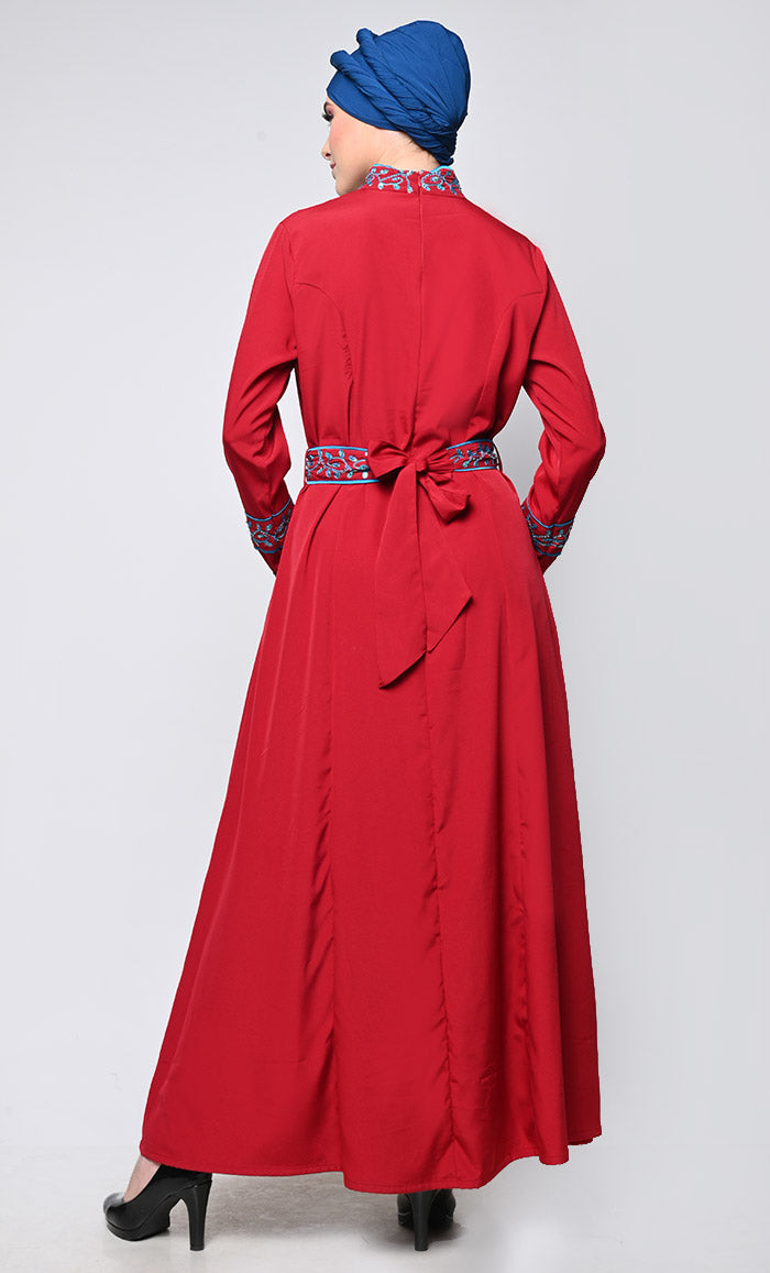 Beautiful Red Contrasted Embellished Squins Work In Front Pannel And On Sleeves Abaya With Embellished Stones Belt