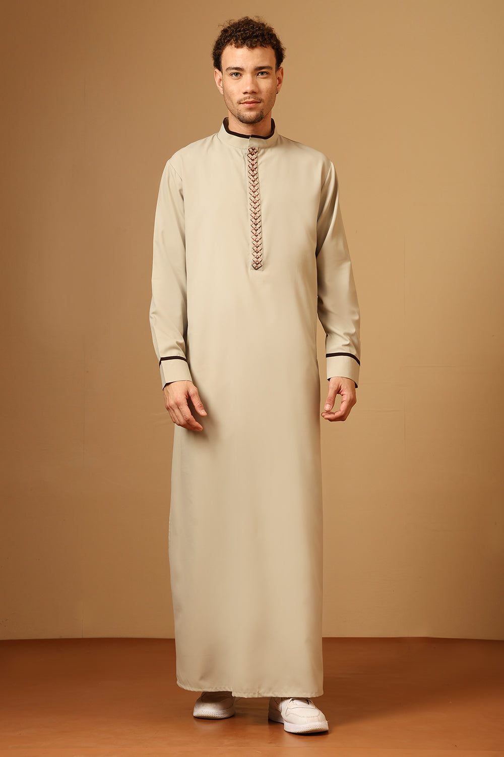 Crafted from a breathable poly-cotton blend, this thobe is designed for durability and all-day ease. The subtle piping design along the neckline and sleeve cuffs adds a modern touch, while the embroidered chest placket enhances its traditional appeal.