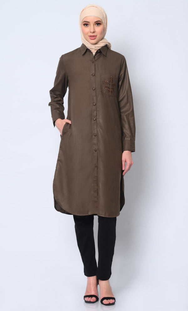 Classic Brown Shirt Tunic with Pocket Embroidery