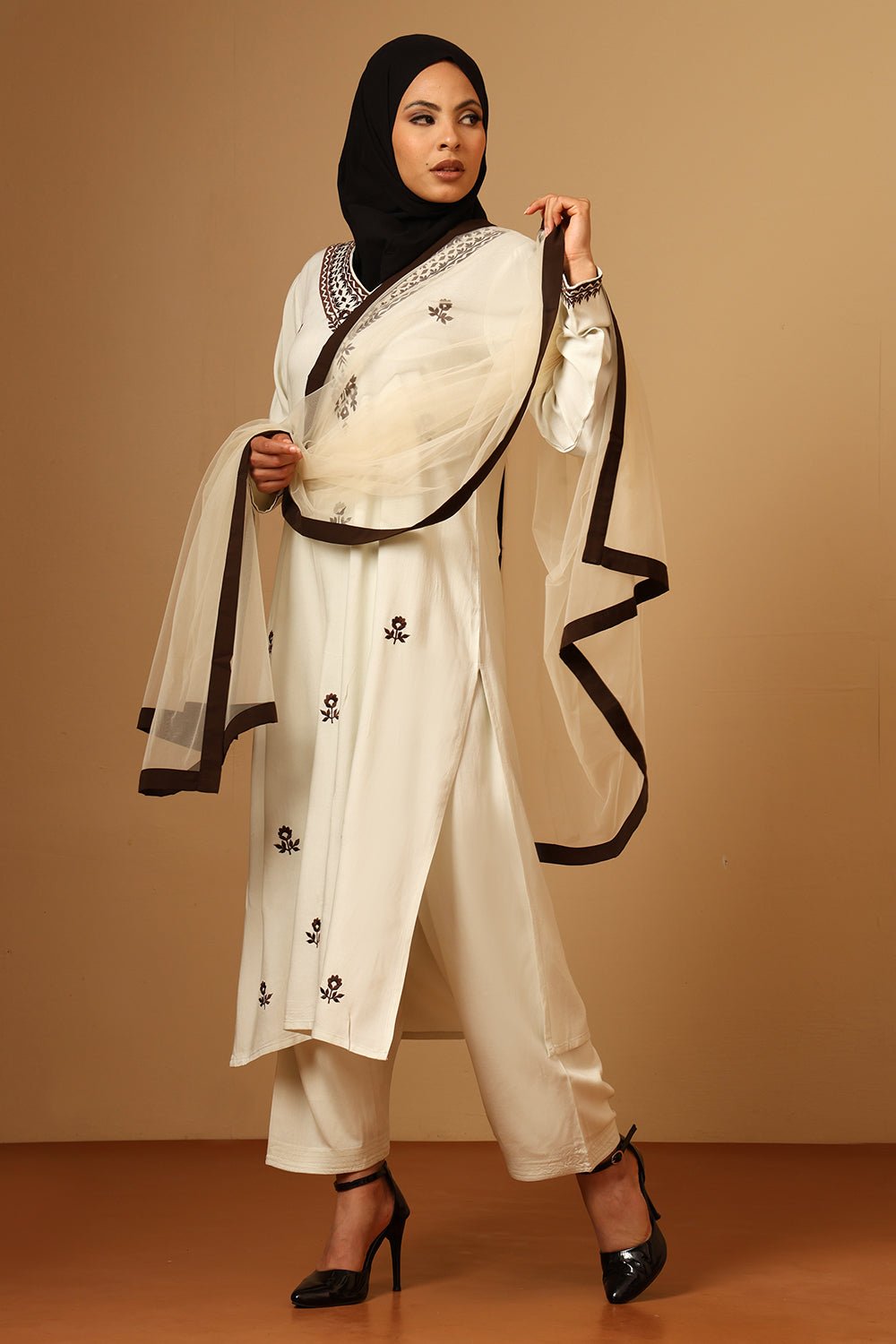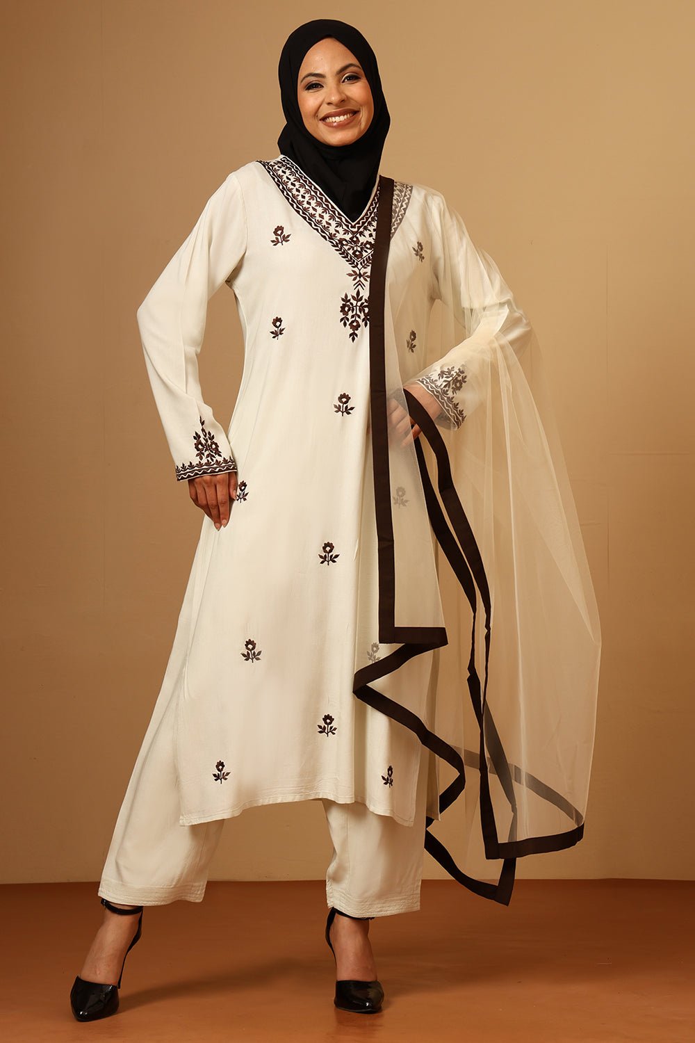 Grace meets sophistication in this beautifully crafted rayon salwar kameez set, designed for women who love timeless modest fashion. Featuring a flattering V-neckline with intricate floral embroidery detailing, this outfit blends elegance with everyday comfort.