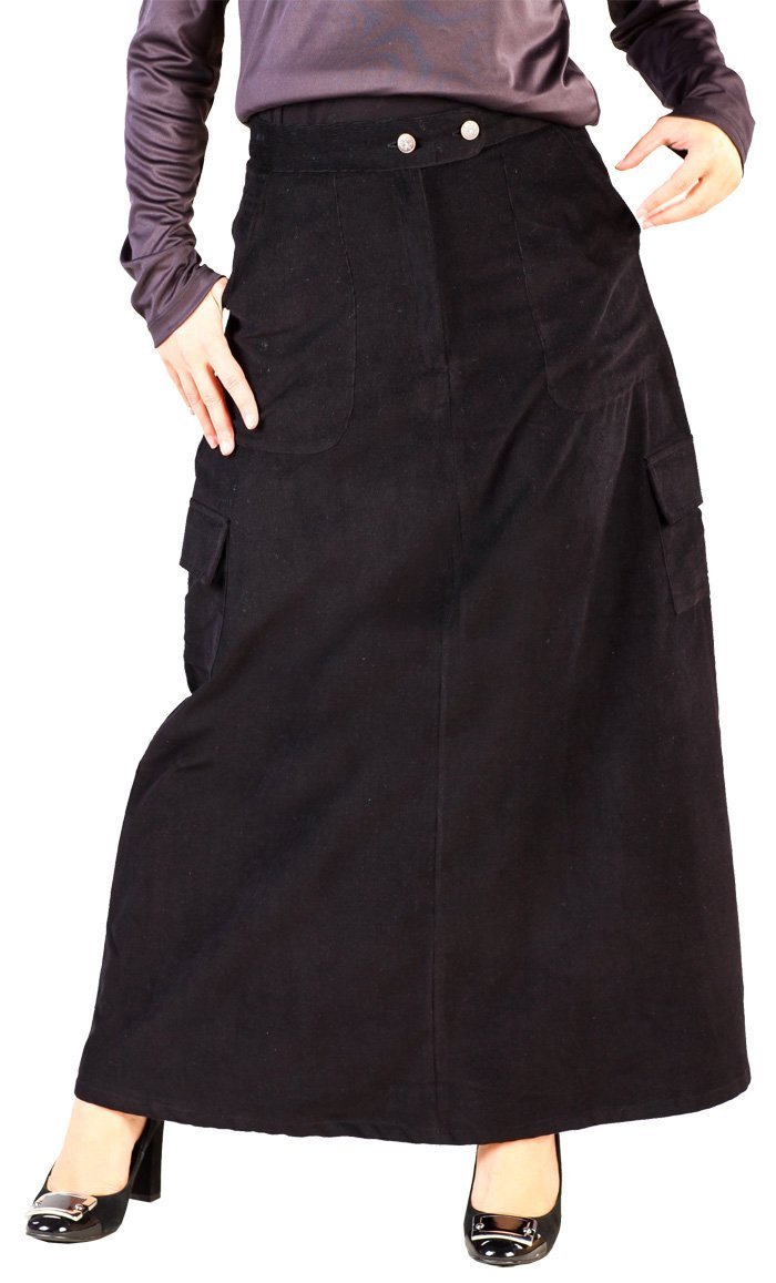 Featuring a beautiful vintage style modest wear long maxi skirt in corduroy fabric accentuated with two buttons detailing on the waistband and envelope style pockets with a buttoned flapover on both the sides. It has a zipper closure placket on the front along with inseamed pockets on the sides with a very free style and comfortable silhouette that perfectly compliments both traditional and contemporary muslimah outfits. Its a go-to must have muslimah signature piece in every women's closet. It is 36-38 inches long.