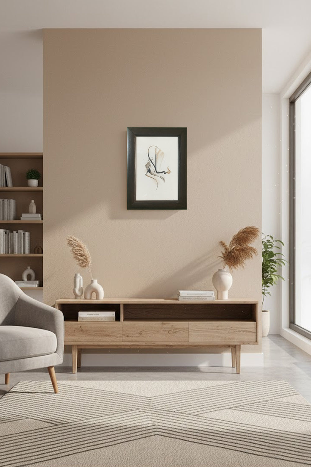 The neutral color palette makes this piece perfect for modern interiors, whether placed in a living room, prayer space, hallway, or bedroom. The elegant framed design enhances the artwork while allowing the delicate calligraphy and artistic strokes to stand out beautifully.