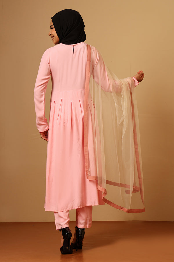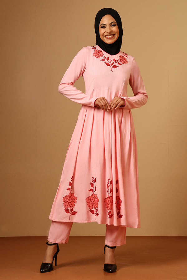 Designed in a flattering flared silhouette, this outfit offers both modest coverage and flowy elegance. The soft rayon fabric ensures breathability and comfort, making it perfect for long gatherings, Ramadan evenings, Eid celebrations, or festive occasions.