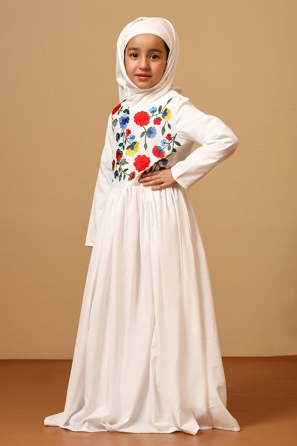 Graceful, charming, and festive-ready — this beautifully designed crepe abaya dress is perfect for your little girl’s special occasions. Crafted from soft and lightweight crepe fabric, the dress features delicate multicolor floral embroidery on the bodice that adds a vibrant yet elegant touch.