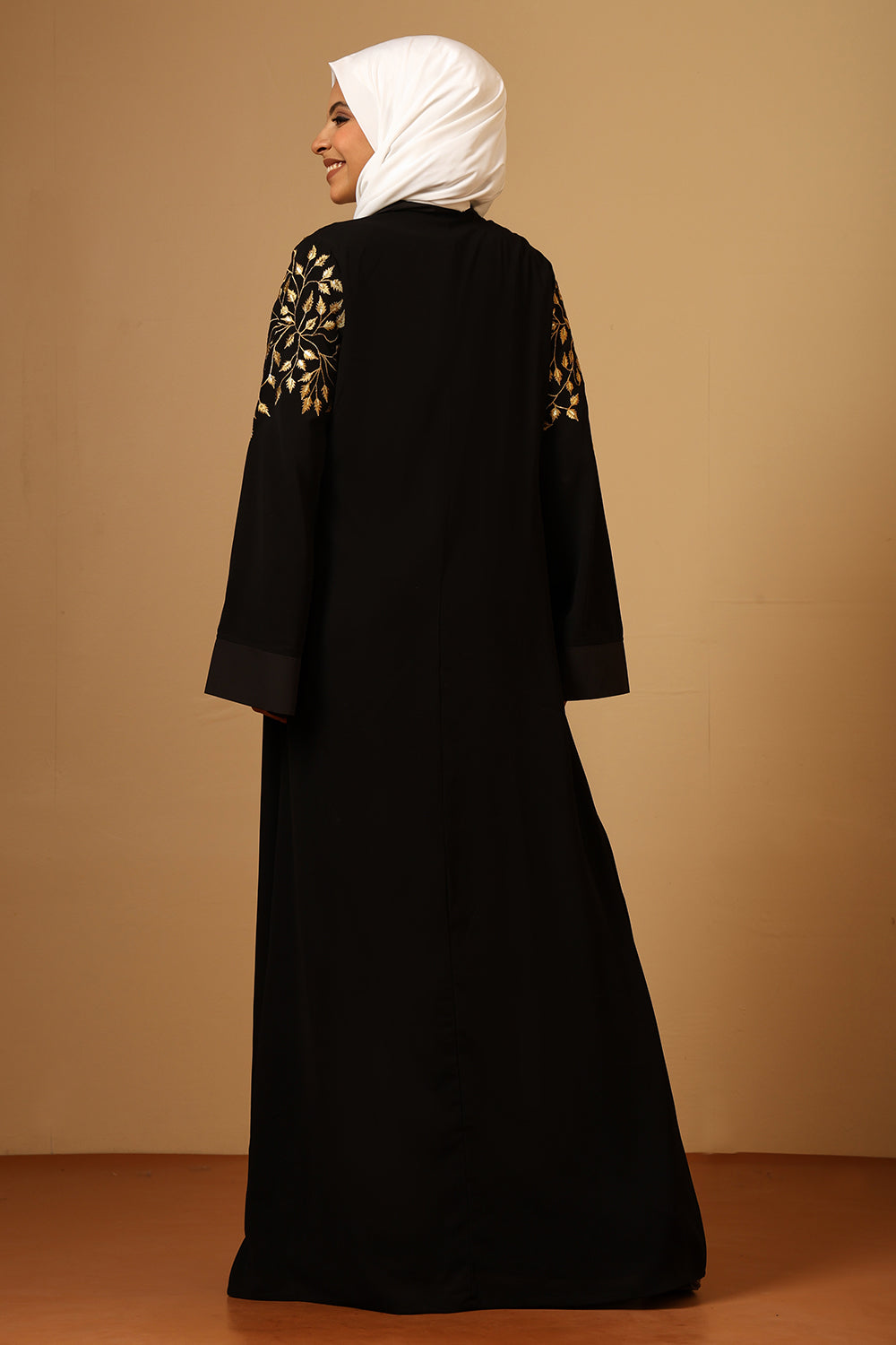 Step into timeless sophistication with the Saalis Abaya, a perfect blend of luxury, comfort, and modest fashion. Crafted from high-quality Firdous fabric, this elegant Black abaya features a Black Dust shawl flap panel adorned with beautiful floral Golden Zari embroidery, creating a stunning contrast that captures attention effortlessly.