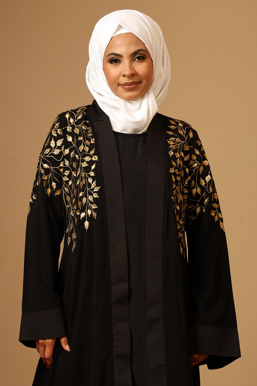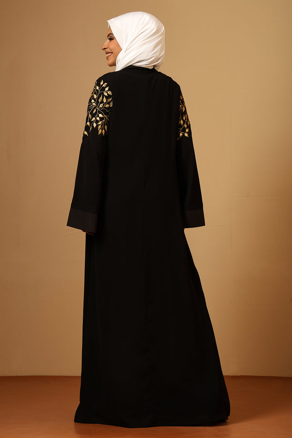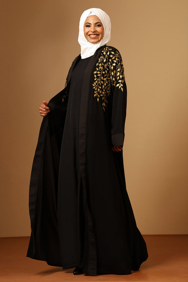 Golden Zari Embroidery front open two pc set Abaya