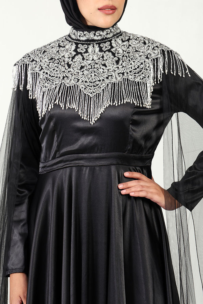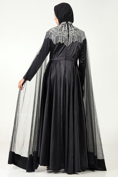 Luxurious Satin Flared Abaya with Metallic Silver Embroidery net drapes