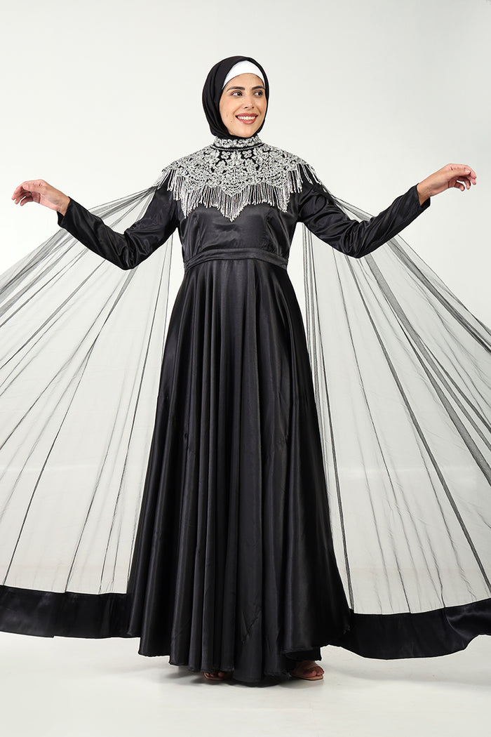 Step into elegance and grace with this stunning flared abaya, designed for special occasions, Eid, and formal gatherings. Made from premium satin fabric, this abaya features a round neck with a back slit opening for a sleek and refined look. The full sleeves provide modest coverage, while the neckline is adorned with fine-quality metallic silver embroidery, adding a touch of glamour. The highlight of this design is the delicate shoulder drapes of net on both sides, creating a flowy and ethereal effect, making this abaya a true statement piece.