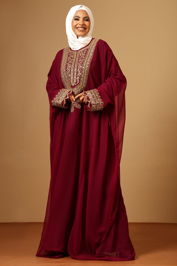 Luxury Wine Fine Georgette Kaftan with Gold Zari Embroidery