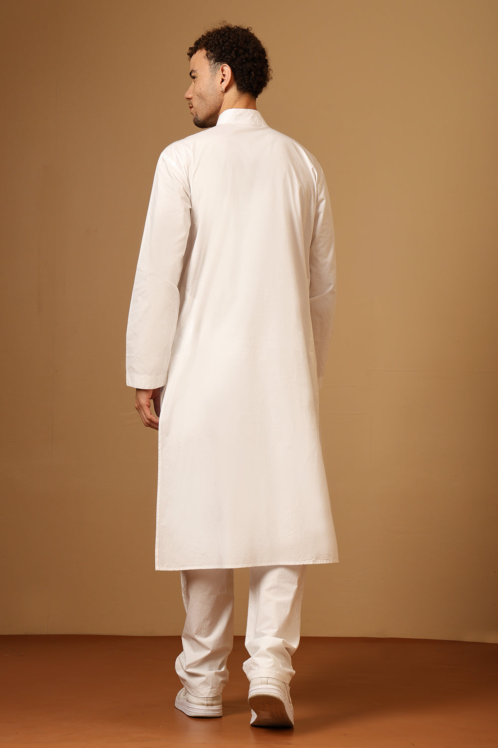 White Cotton Poplin Kurta Set with Embroidered Neck