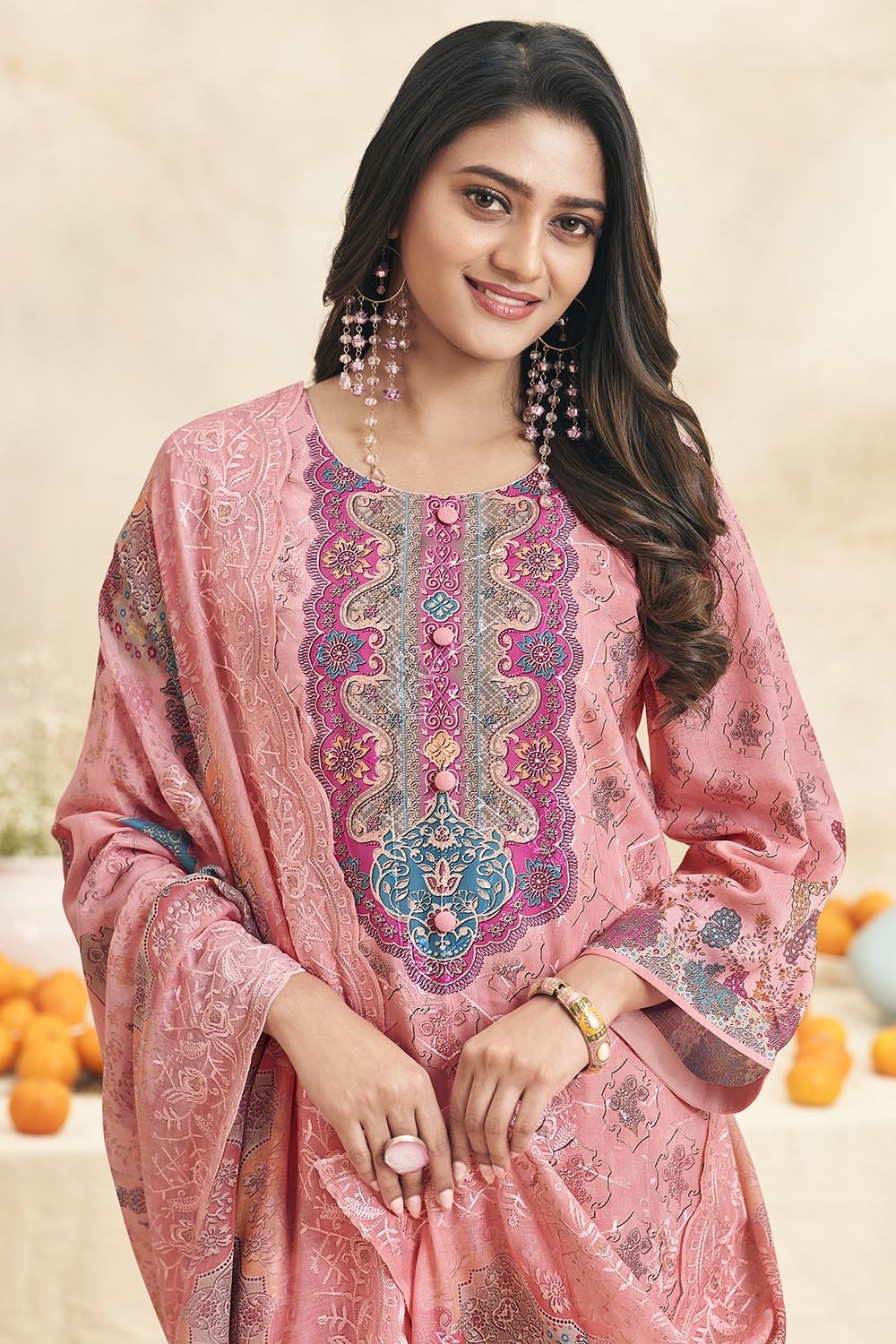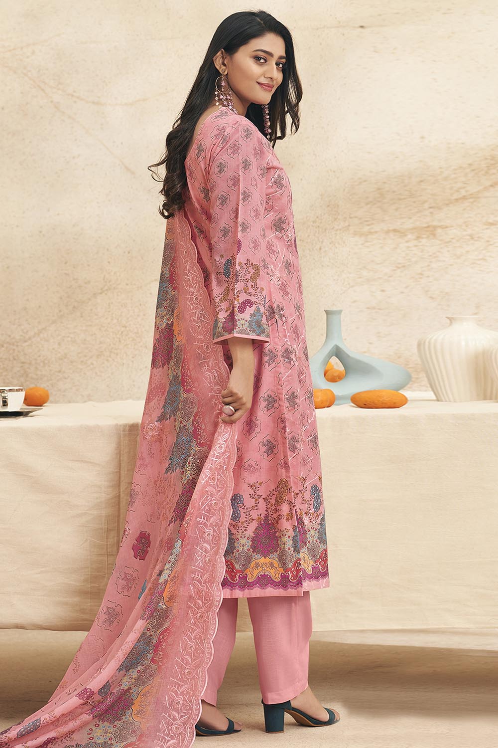 Refresh your ethnic collection with this elegant printed cotton kameez pant set. The A-line cotton kurta features a round neckline and 3/4th sleeves, adorned with vibrant floral prints that bring charm and grace to any occasion. It is paired with straight cotton pants and a matching printed cotton dupatta for a breezy, comfortable yet stylish outfit. Perfect for casual gatherings, festive wear, and office wear.