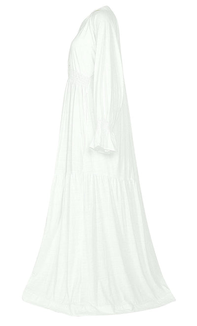 Be each day comfortable with beautiful modest jersey Abaya.It has a collar neck with front button down detailing with gathers on bottom and smoking on waist ,full sleeves with smoking detailing on cuffs and included pockets on Abaya for your better utility